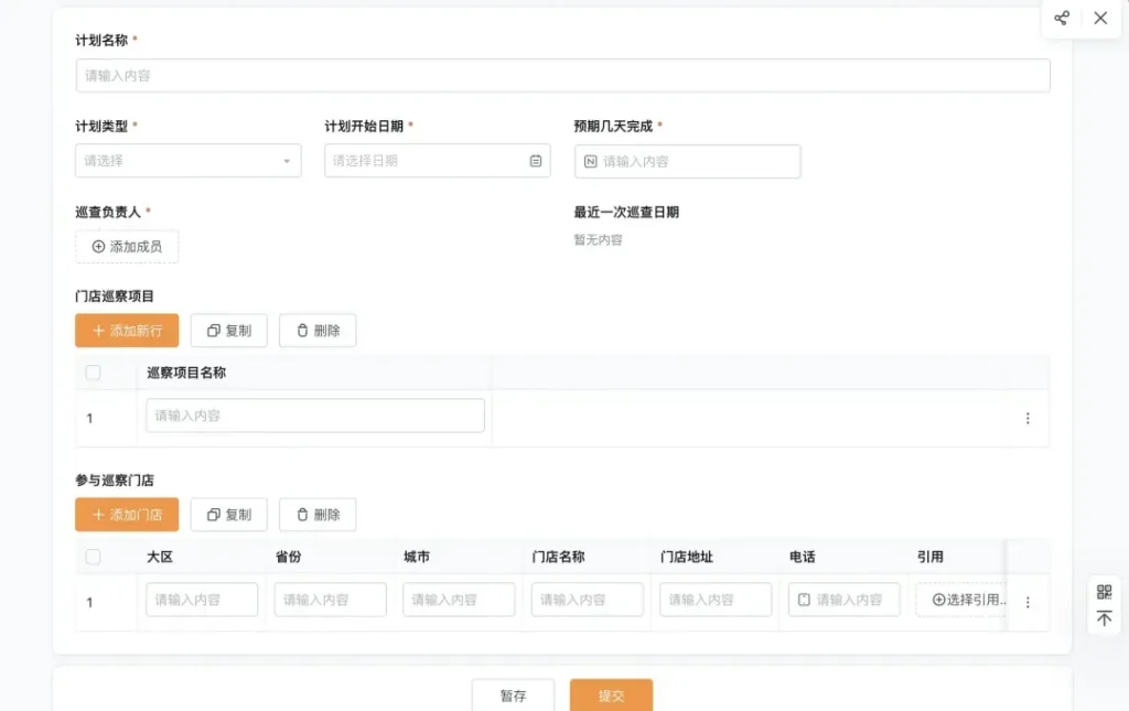 - 计划制定:缺乏系统性,覆盖有遗漏 巡检计划制定依赖人工梳理,需手动统计门店信息、匹配巡检项目,易出现“重点区域漏排、巡检周期不合理”等问题;计划责任划分不清晰,缺乏与巡检人员的高效联动,导致计划落地执行力弱,难以保障巡检工作的周期性和全面性。