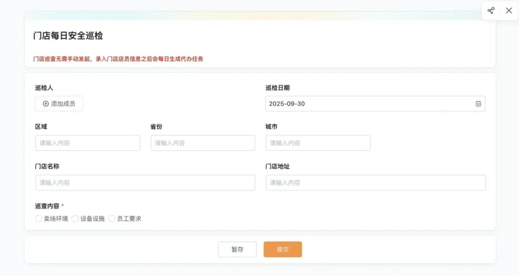 ● 自动任务生成:录入门店基础信息后,系统可每日自动生成安全巡检任务,无需人工手动发起,从源头避免日常巡检遗漏,保障安全检查的常态化开展;