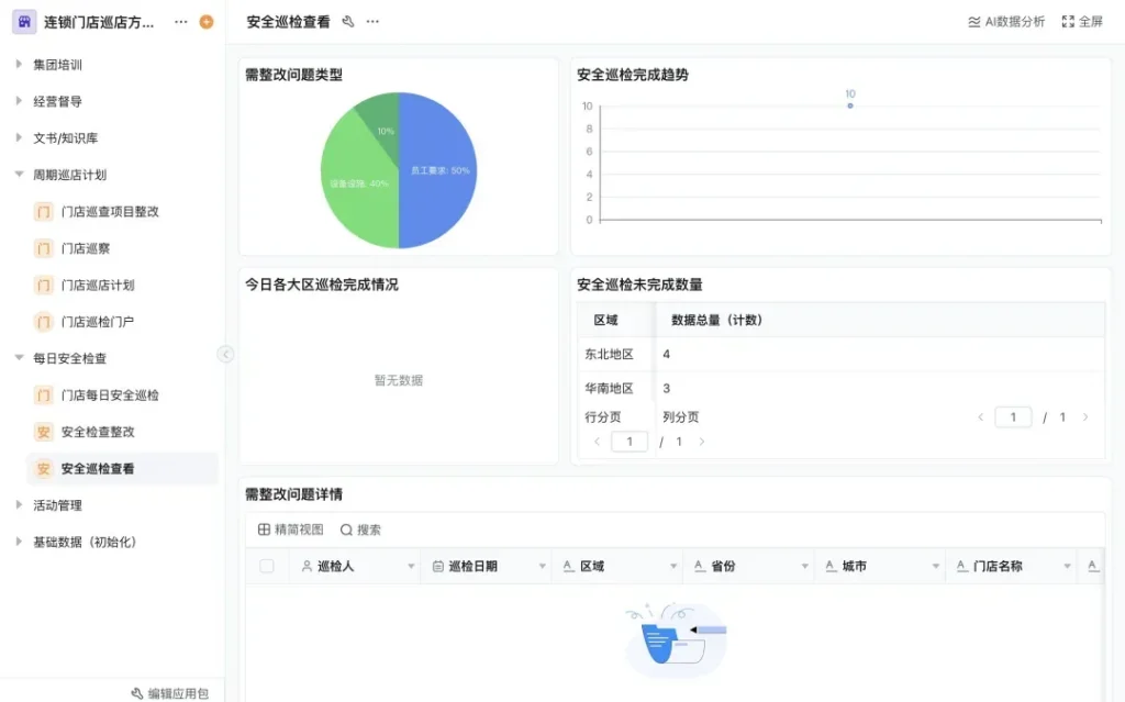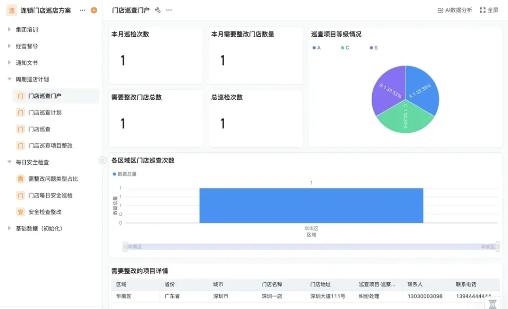 ● 门店巡查门户:核心指标一键掌控,可直接查看“本月巡检次数、需整改门店数、总巡检次数”等核心数据,无需人工汇总统计;通过饼图实现项目等级可视化,快速掌握不同类型问题的占比;借助条形图展示区域巡查统计数据,精准聚焦重点区域,提升巡检资源配置效率;支持整改详情精准查询,直接查看需整改门店的“区域、省份、地址、巡查项目、联系人”等信息,无需翻找资料即可快速定位问题门店;