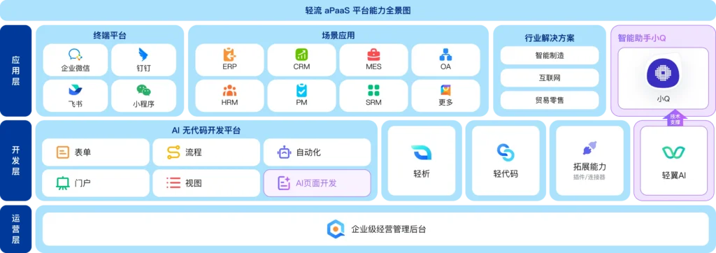 作为专精特新企业,轻流平台创新性融合 AI 与无代码能力,打造新一代开发模式:通过自然语言描述即可自动生成表单、流程、数据结构和页面布局,业务变更时 AI 可提供调整建议或一键优化,交付速度较传统方式缩短 95% 以上。轻流AI 模块涵盖 AI 销售、HR、法务等专家数字员工,搭配 AI 按钮、AI 节点等功能,深度嵌入系统搭建全流程。