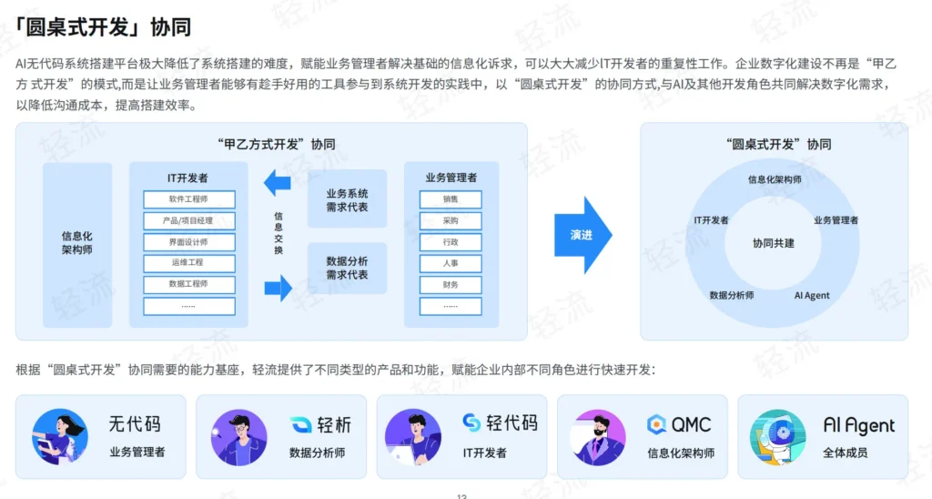 轻流的AI无代码系统搭建平台极大降低了系统搭建的难度,赋能业务管理者解决基础的信息化诉求,可以大大减少 IT 开发者的重复性工作。企业数字化建设不再是 “甲乙方方式开发” 的模式,而是让业务管理者能够有趁手好用的工具参与到系统开发的实践中,以 “圆桌式开发” 的协同方式,与 AI 及其他开发角色共同解决数字化需求,以降低沟通成本,提高搭建效率。