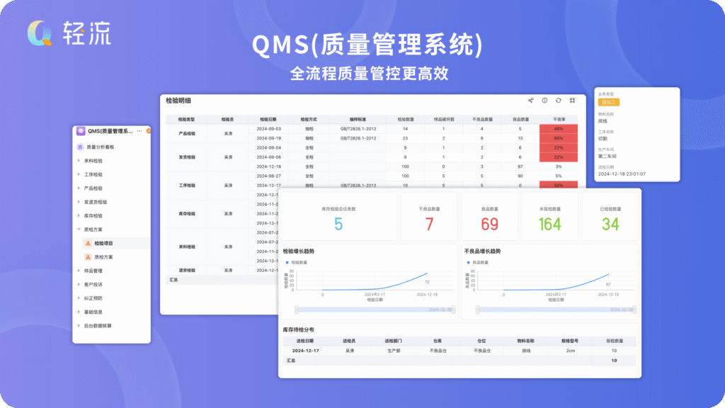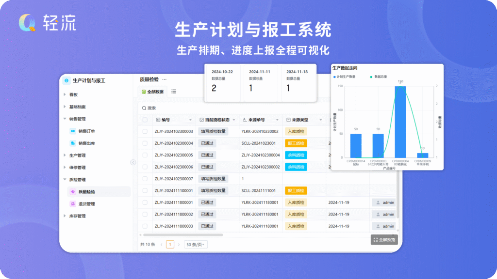 通过数字化检验流程与审批节点,将质量管控嵌入生产全链条。从来料检验到成品发货,质检人员在轻流系统中记录检验数据; 质检数据自动同步至质量看板,不良品可一键触发返工、报废等流转流程,所有记录实时存档可追溯。