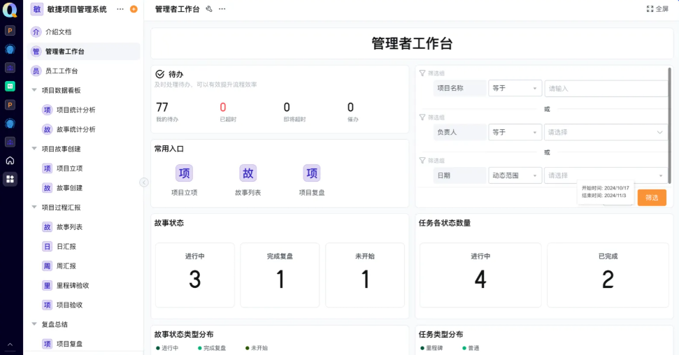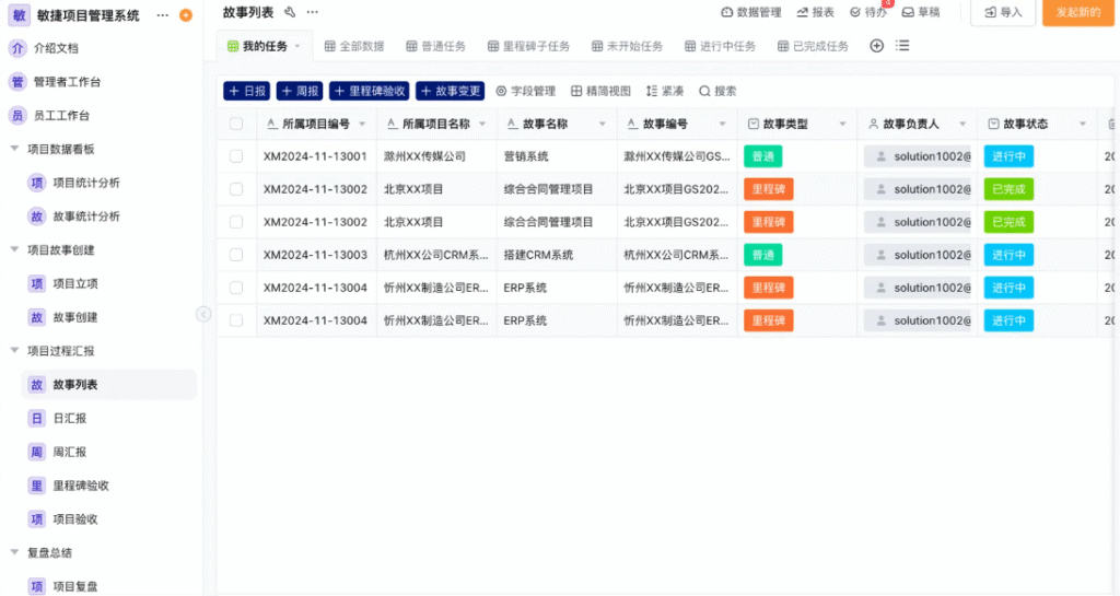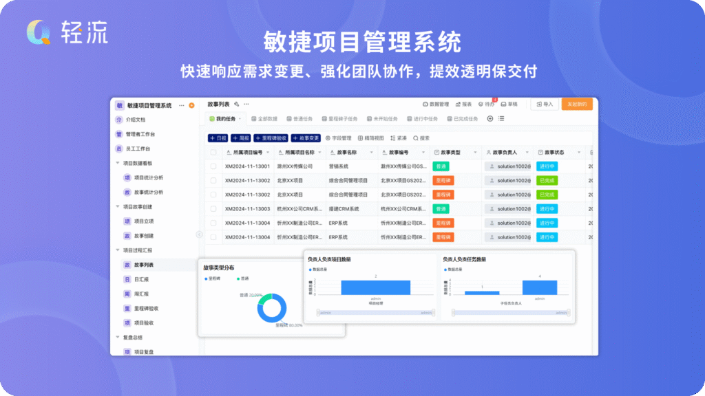 对于管理者来说,可通过工作台掌握项目全局,及时发现问题并调整,从而高效推进管理。轻流系统整合了项目立项 – 故事管理 – 过程汇报 – 复盘总结的全流程模块,管理者可在一个平台内完成项目从启动到收尾的全周期管理,确保敏捷管理的计划 – 执行 – 反馈 – 优化闭环高效运转。