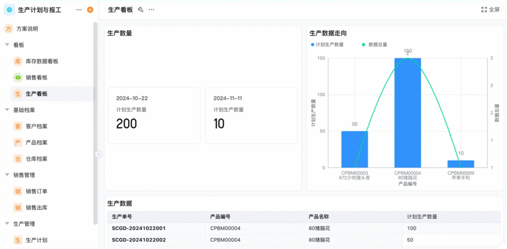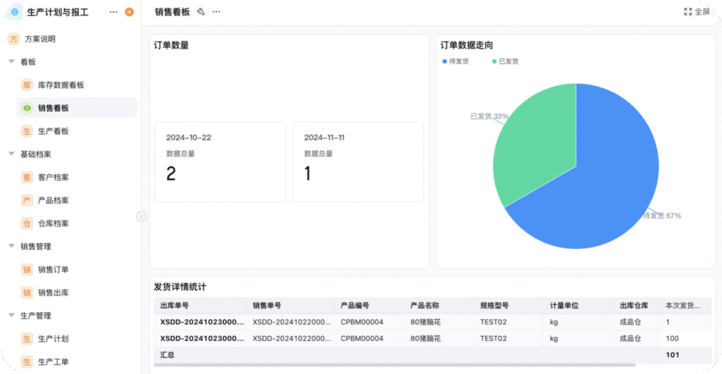 通过销售中心模块的订单管理功能与数据仪表盘,实现订单创建 – 进度追踪 – 交付提醒全线上化。