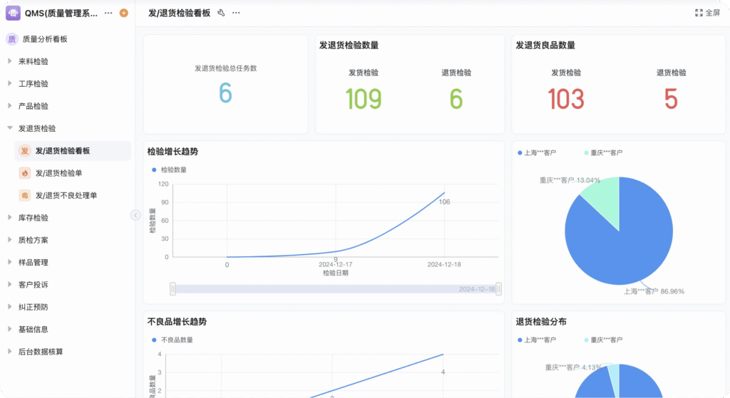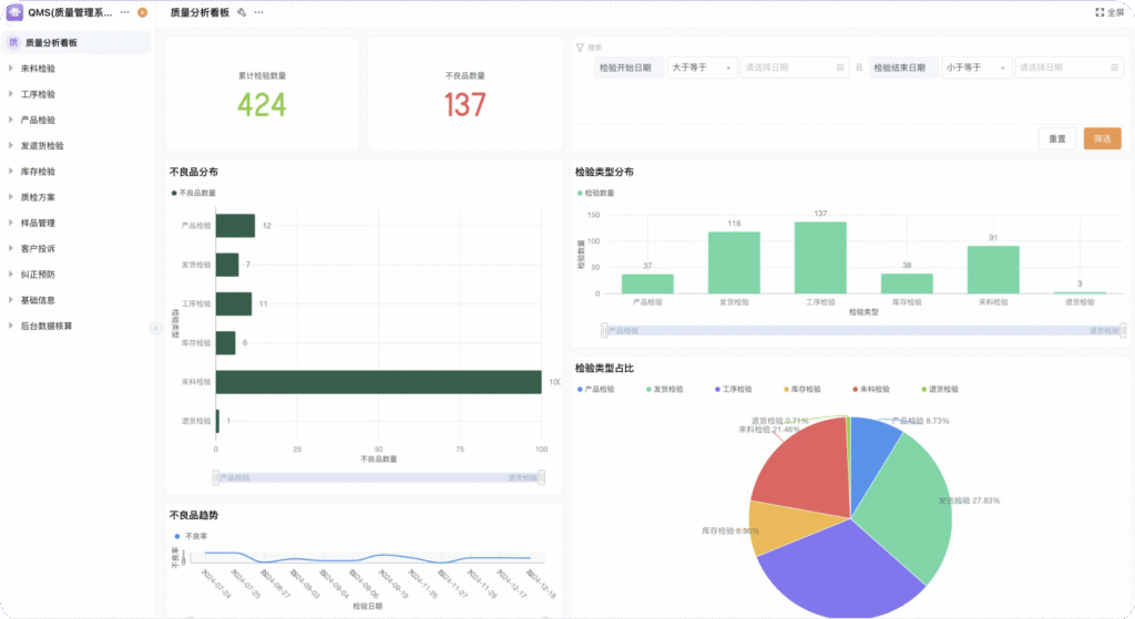 如遇不良品过多的情况,可以创建质量分析看板,了解不良品总量和趋势。对产品检验、发货检验、工序检验、库存检验、来料检验、退货检验各个环节检验出的不良品进行数据汇总和拆分,具体问题具体分析。