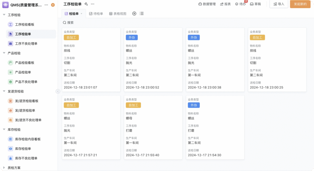 使用轻流QMS建立检验单、待检单,明确标注业务类型、物料名称、工序名称、生产车间和送检时间,通过一个个卡片的形式快速查阅检验情况。