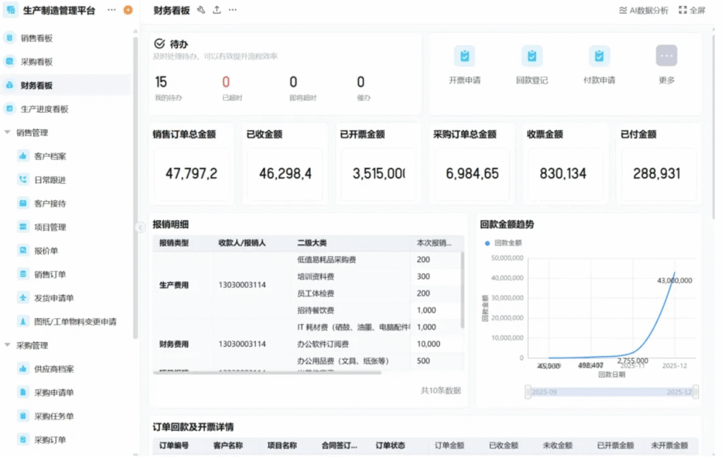 - 收支实时汇总: 整合销售回款与采购支出,展示已收/未收、已开票/未开票等财务明细,清晰呈现企业现金流状况。