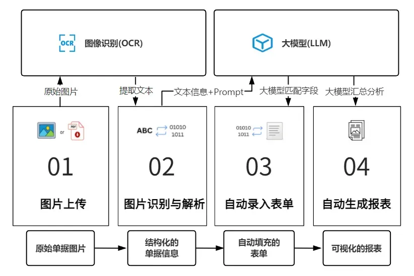 依托 OCR+LLM 协同架构:OCR 完成图像预处理与字符识别,输出非结构化文本;LLM 执行实体抽取,将文本转化为含业务字段的结构化键值对数据。输入原始图像,输出结构化数据集合。