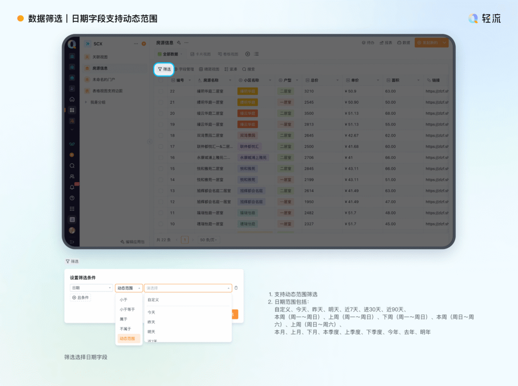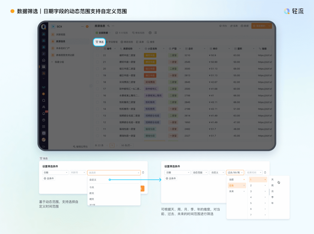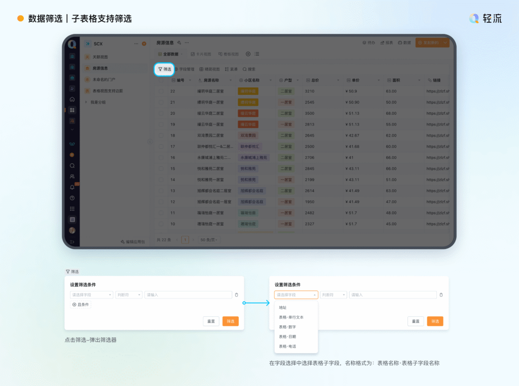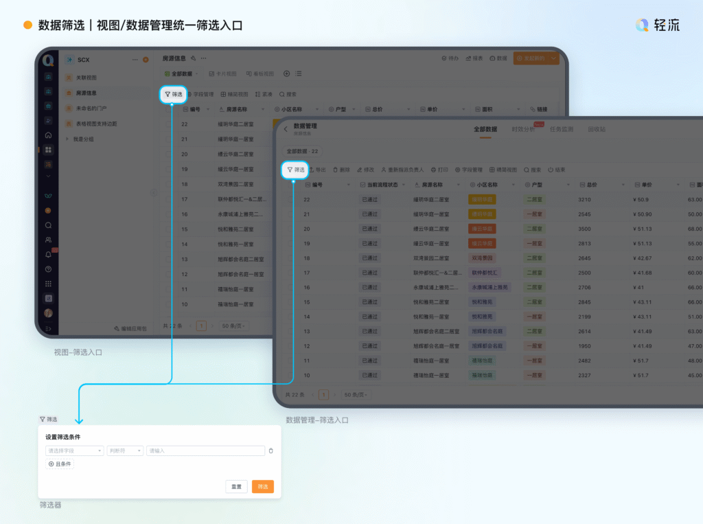 现在,轻流在视图页和数据管理页顶部新增 「筛选」 按钮——点击一次,即可集中设置多个筛选条件,统一管理筛选逻辑,操作更便捷,检查更高效!