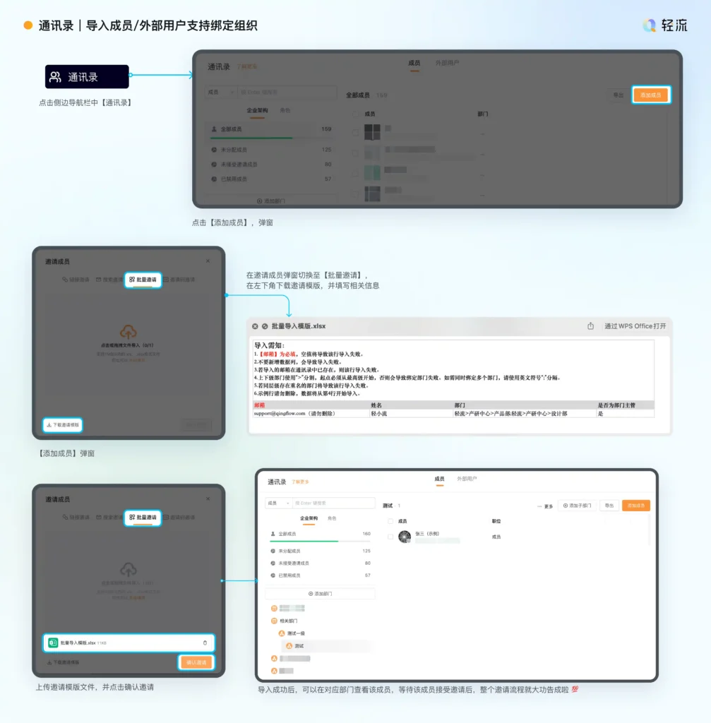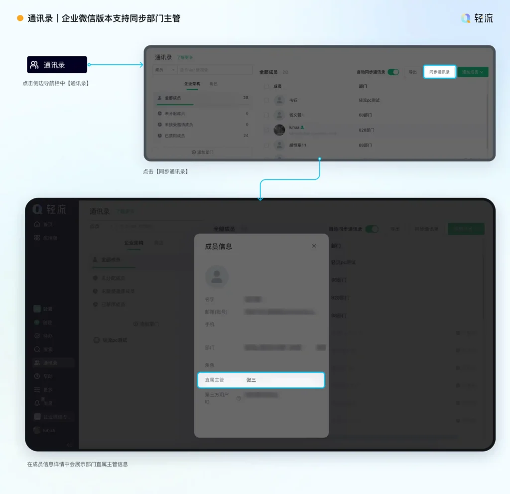 之前批量导入成员后,要手动绑定部门、设主管。现在升级后: