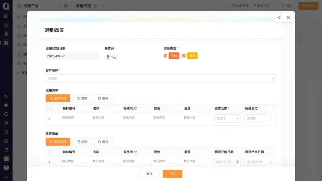 针对租赁业务中常见的退租、改签需求,平台提供标准化操作流程。支持在线发起退租、改签申请,通过「选择物料」功能精准关联对应租赁资产,线上完成相关信息核对与流程审批。彻底解决传统退租改签流程混乱、信息传递不及时的问题,保障租赁双方权益,提升客户服务体验。