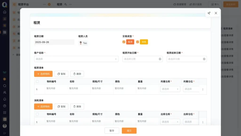 平台实现租赁流程的标准化与线上化,业务人员只需填写「租赁日期」「客户名称」「租赁起止日期」等关键信息,通过「选择物料」功能快速添加租赁品或消耗品,系统自动关联对应仓库与货位信息,完成租赁单的线上提交与审核流转。全程无需纸质单据,大幅简化操作流程,提升租赁业务办理效率,同时确保流程可追溯、责任可明确。