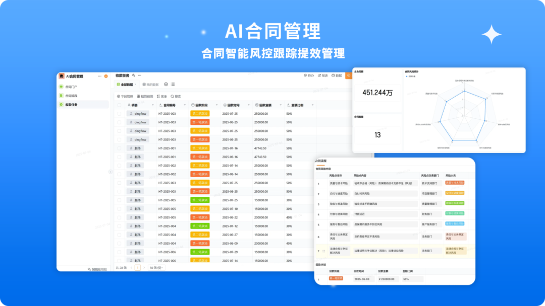 管理层关心的合同总额、风险分布、回款进度,无需手动统计!