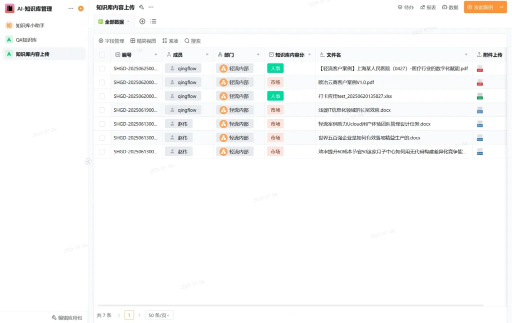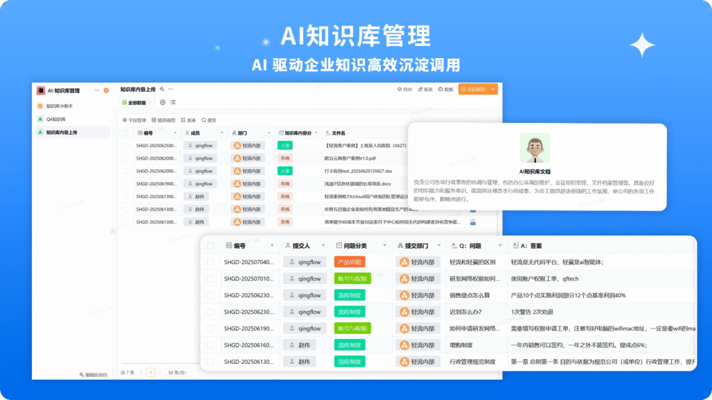 轻流AI可自动抓取企业文档、制度、案例等内容,涵盖售前支持资料、业务跟单素材、公司重要资料及视频等各类资源,智能分析并生成结构化问答知识库。