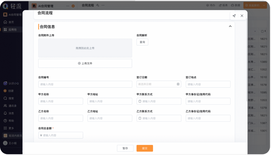 轻流AI可自动解析合同文本,精准提取甲方、乙方、金额、周期、违约责任等核心条款,自动生成结构化数据。无论是数十页的复杂协议,还是多版本的修订文件,AI都能快速识别关键信息,让合同建档效率提升数倍,为后续管理打好“数据基础”。