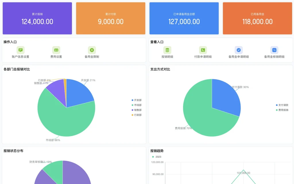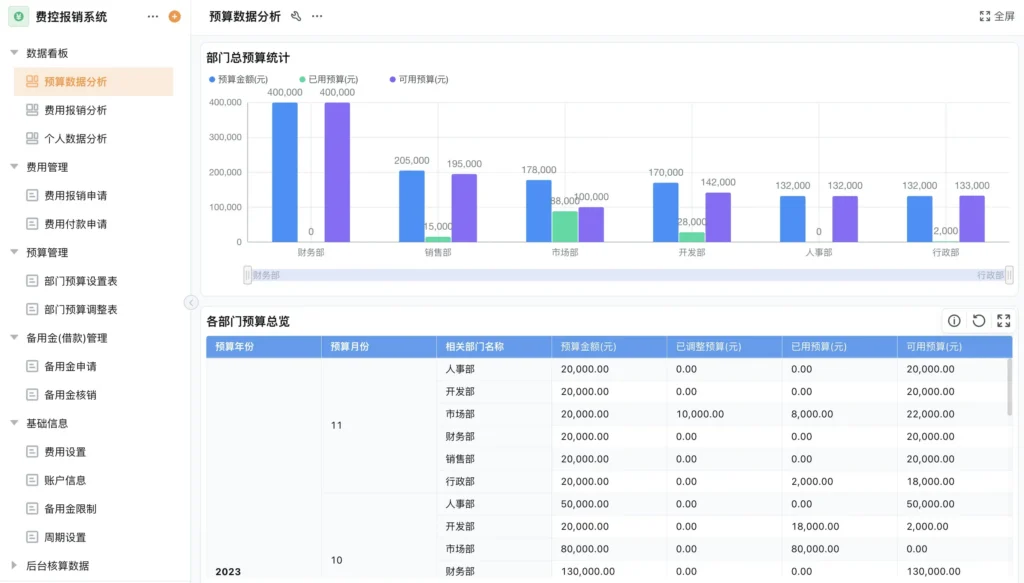 系统自动汇总整合费用报销、预算使用、备用金周转等全量数据,生成财务流水、部门费用报表等可视化图表,企业财务情况实时可查。管理层可通过数据直观掌握各部门预算总额、已用金额、可用金额及预算调整情况,部门费用对比、费用种类占比等核心信息一目了然,为预算调整、成本优化等决策提供精准的数据支撑。