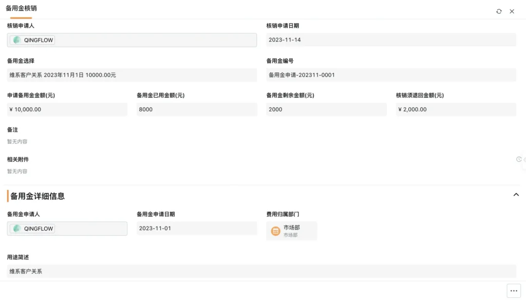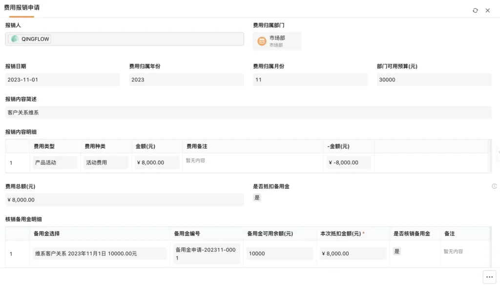 员工发起报销申请时,系统实时关联所在部门可用预算,自动判断报销金额是否超出预算,避免超支报销;支持选择报销金额抵扣备用金,选择后流程自动流转,无需员工再次发起备用金核销申请,大幅简化操作步骤,提升员工报销体验。
