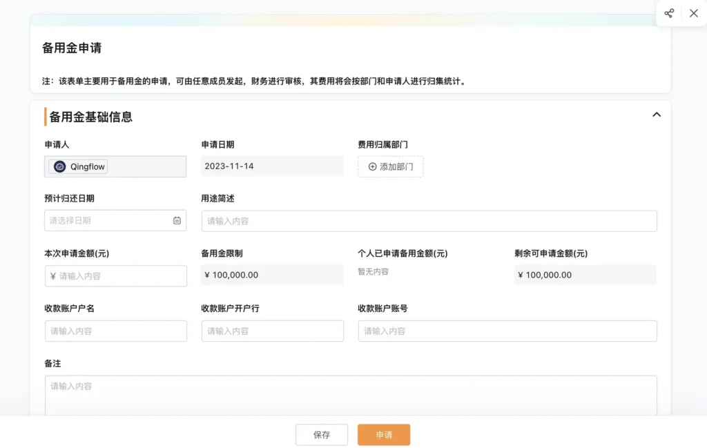 模板内置标准化的备用金管理、预算限额设置规则,明确各部门、各岗位的费用使用权限。员工发起申请时,系统自动关联相关规则,超出限额的申请将无法提交,从源头规避不合理费用支出;同时,费用报销、备用金核销等流程自动流转,无需人工干预,减少人为操作失误。