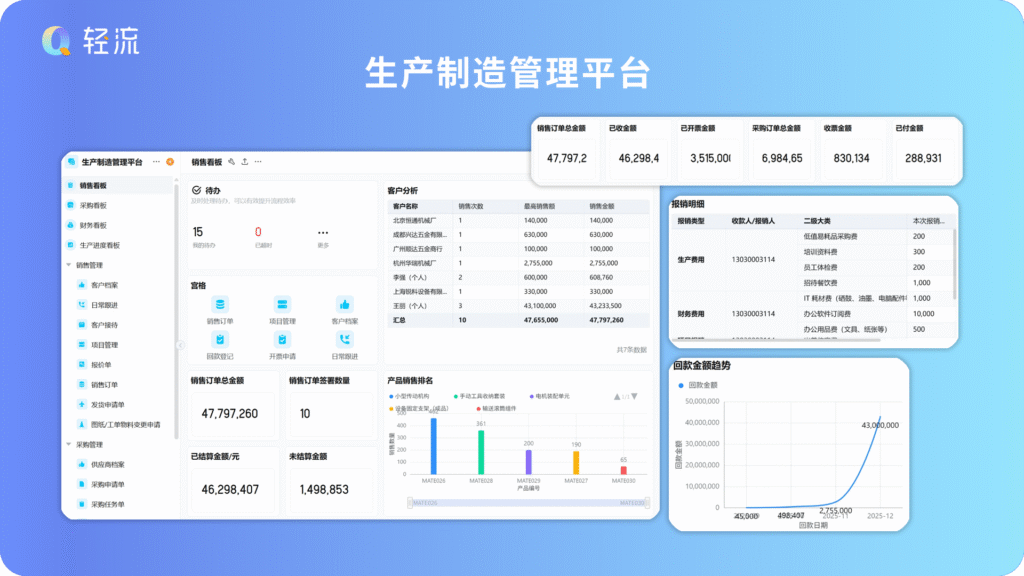 报销与回款管理:展示「报销明细」,支持在线管理「报销流程」;生成「回款金额趋势图」,直观呈现回款节奏,辅助现金流管理