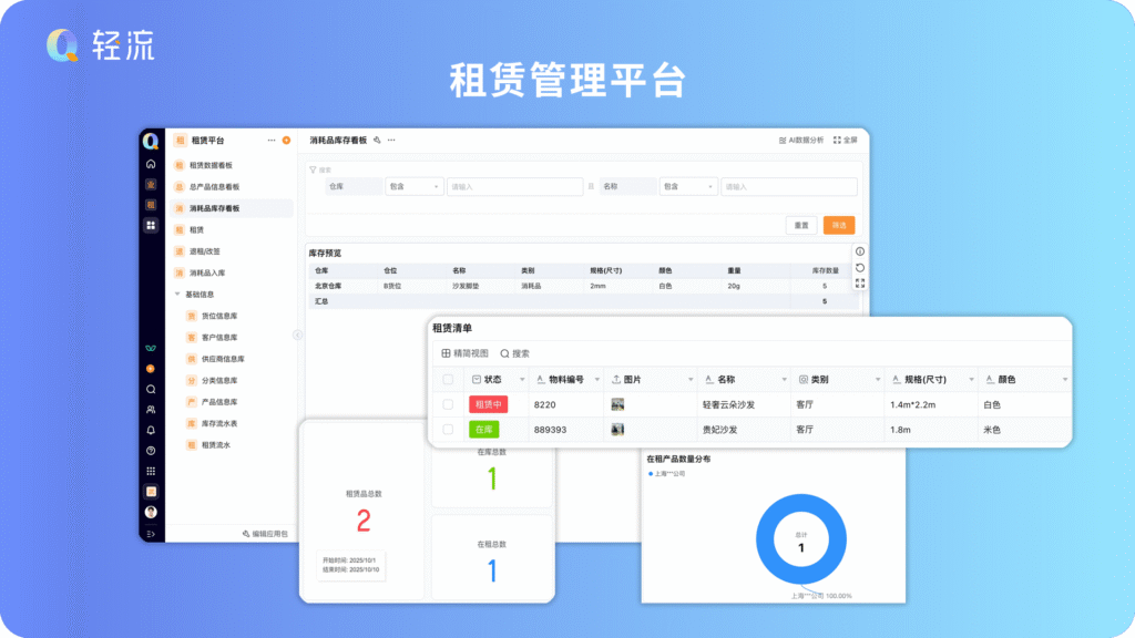 租赁数据看板:直观展示「租赁总数」、「在库总数」、「在租总数」,通过图表呈现 “在租产品的企业分布”,快速掌握当前业务量