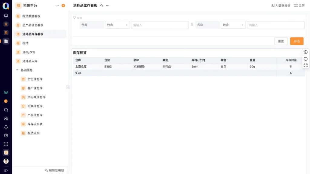消耗品库存看板:支持按「仓库」、「名称」筛选,展示消耗品的「仓库」、「货位」、「规格」、「库存数量」,还能统计汇总库存,避免消耗品缺货/积压
