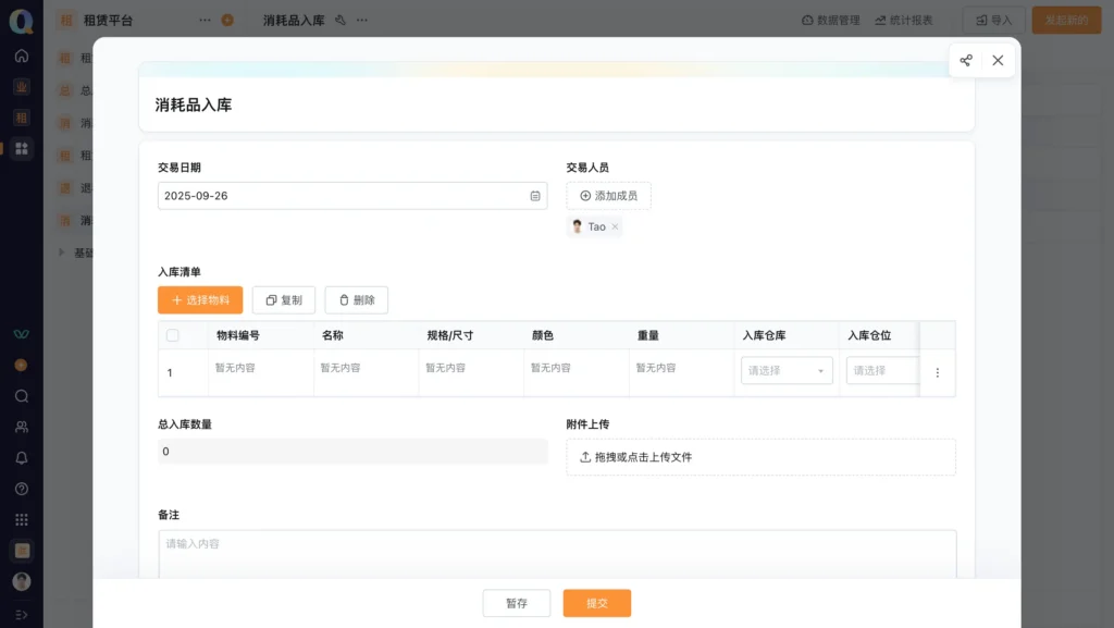 消耗品入库:填写「交易日期」、「交易人员」,添加入库物料并选择「入库仓库/货位」,上传采购凭证等附件,同步统计「总入库数量」,确保消耗品入库可追溯