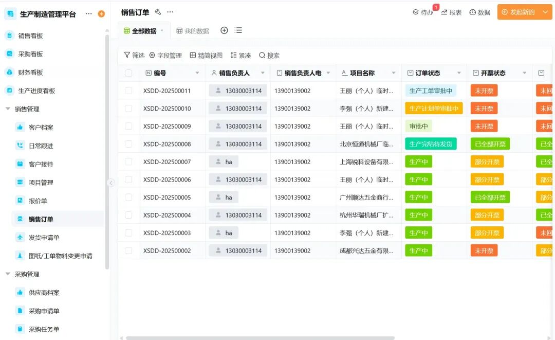 销售订单全流程跟踪:可查看「订单编号」、「负责人」、「客户名称」,以及「订单状态」、「开票状态」、「回款状态」,实现从接单到回款的全链路可视化;支持「筛选」、「字段管理」、「视图切换」,方便快速定位订单进度
