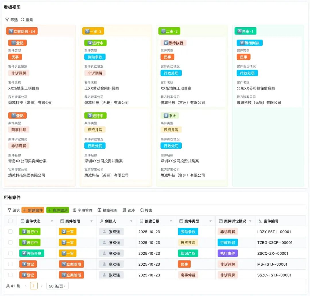 案件阶段分类:通过「立案阶段」、「一审」、「二审」、「再审」等看板,将案件按流程阶段归类,直观呈现各阶段的案件数量
