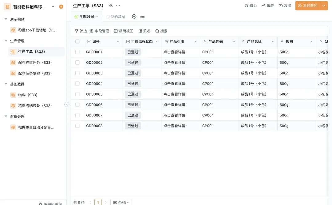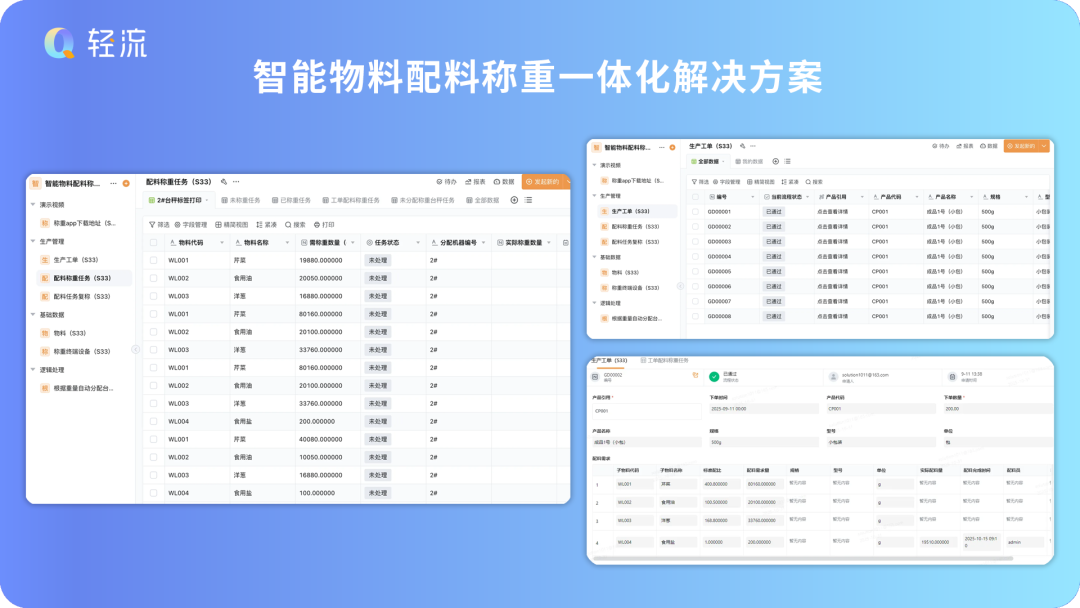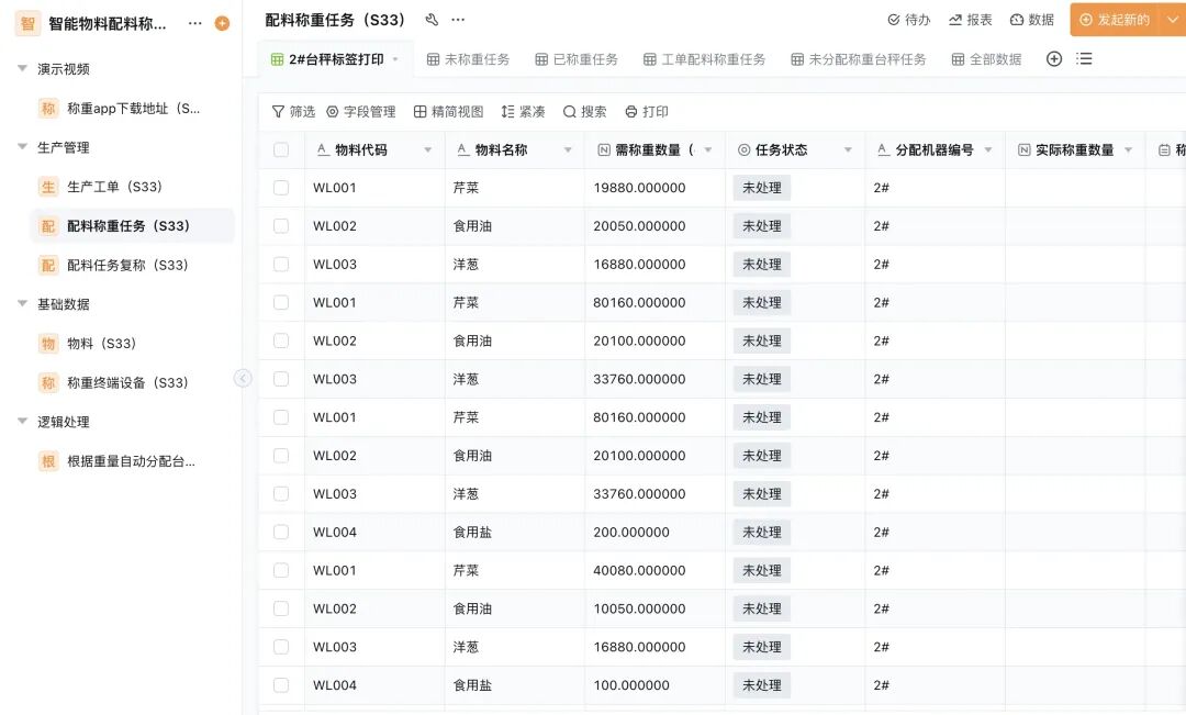 配料称重任务:记录「实际配料量」、「任务状态」、「分配机器型号」,实现配料过程可追溯,支撑质量管控