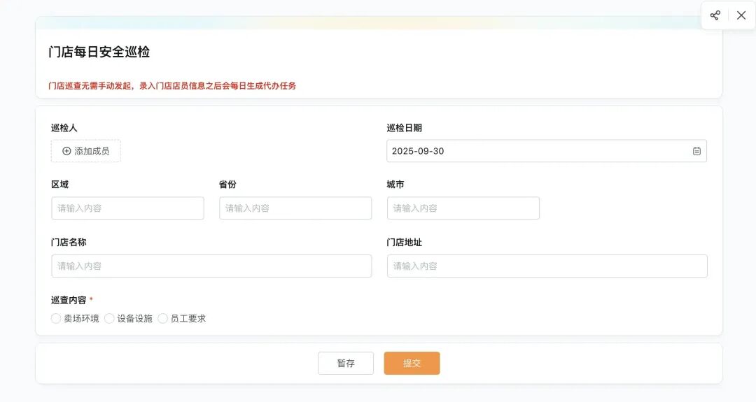 信息填写功能:填写「巡检人」、「巡检日期」、「区域」、「门店名称」等信息,记录每次安全巡检的具体情况