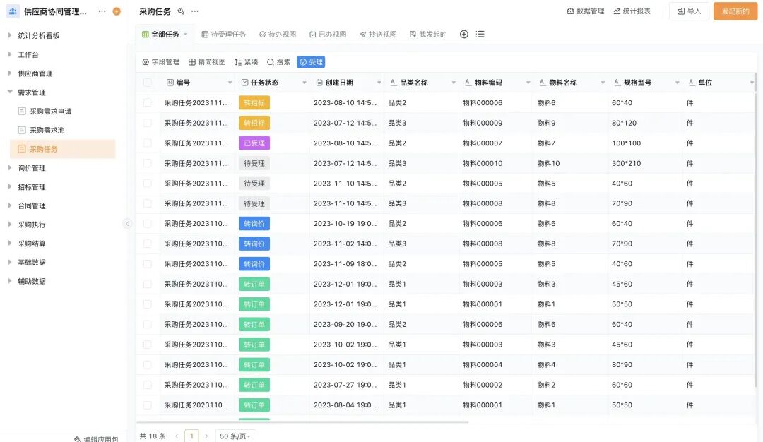 任务状态精细化管理:支持「待受理」、「已受理」、「转招标」、「转询价」 等多状态分类,清晰区分不同进度的采购任务