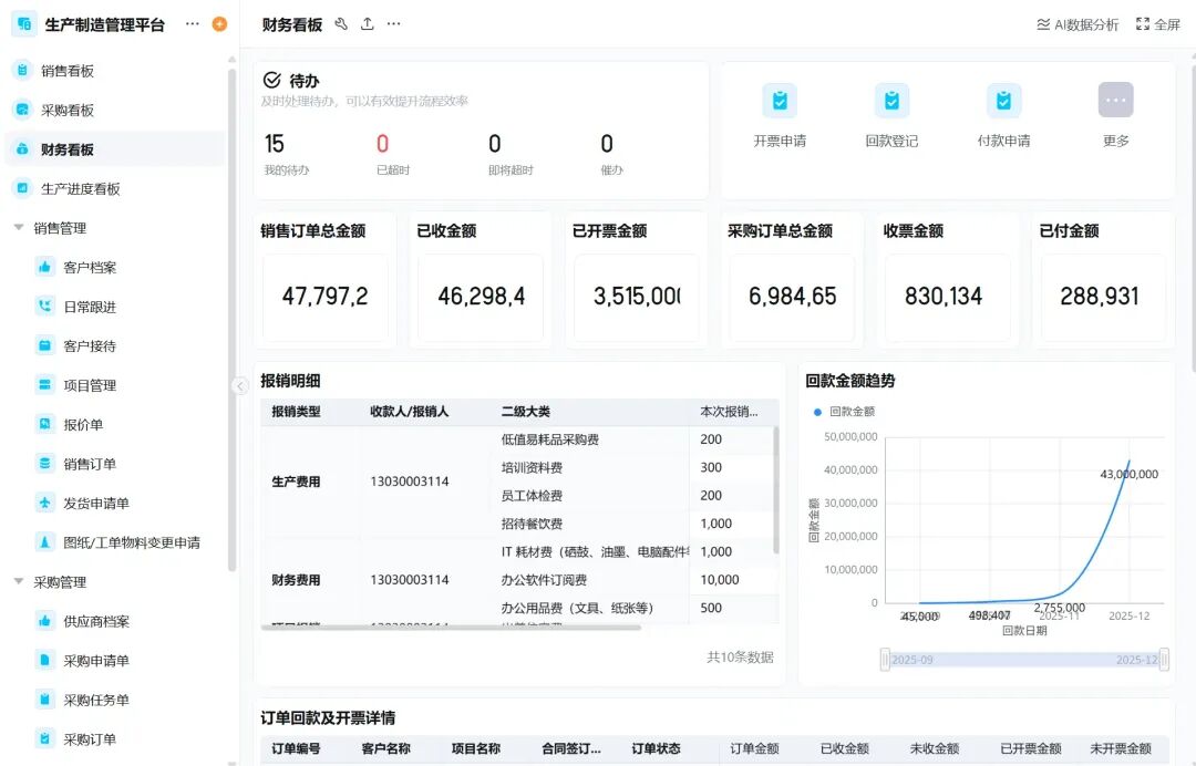 报销与回款管理:展示「报销明细」,支持在线管理「报销流程」;生成「回款金额趋势图」,直观呈现回款节奏,辅助现金流管理
