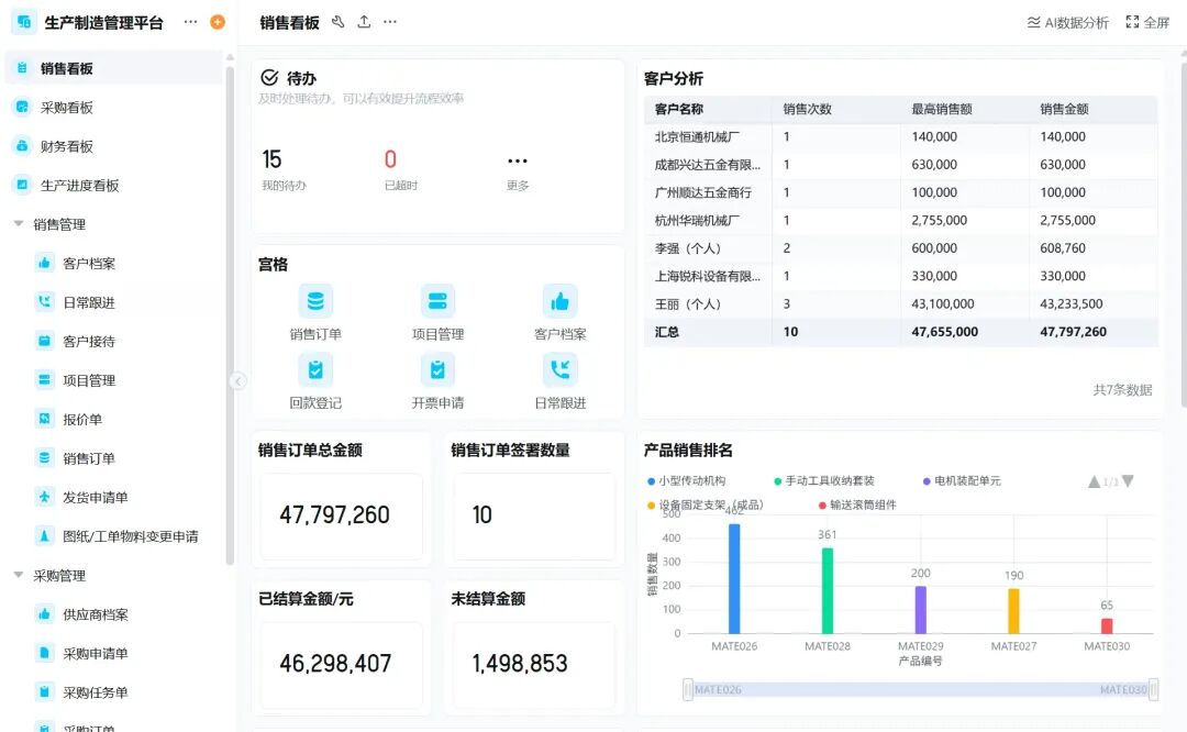 销售数据看板与客户分析:自动统计「销售订单总金额」、「已签数量」、「已结算/未结算金额」,并生成「销售次数」、「最高销售额」、「累计金额」等客户销售分析,帮企业识别高价值客户;支持按「产品编号」统计销量,展示「产品销售排名」,辅助销售策略调整