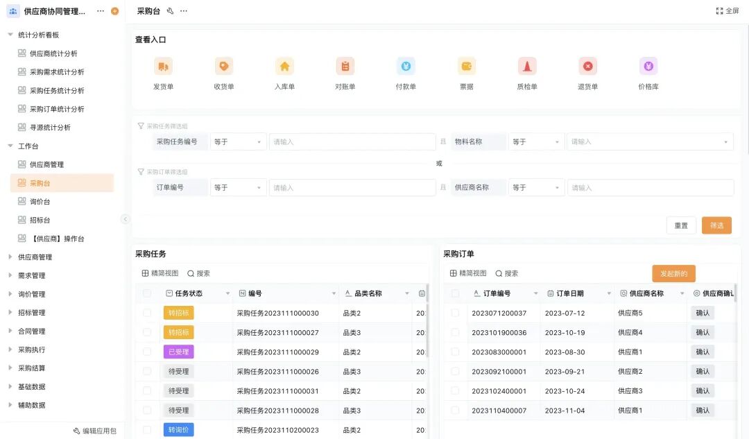 采购任务与订单精准筛选:支持按任务编号、物料、订单编号、供应商等条件筛选,快速定位目标任务/订单,提升查询效率