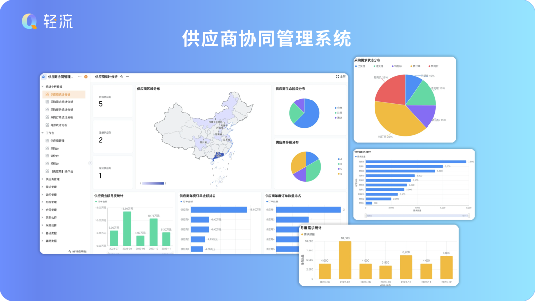 供应商全维度画像管理:支持统计合格/注册/淘汰供应商数量,结合区域分布、生命周期阶段、等级分类,快速掌握供应商整体结构
