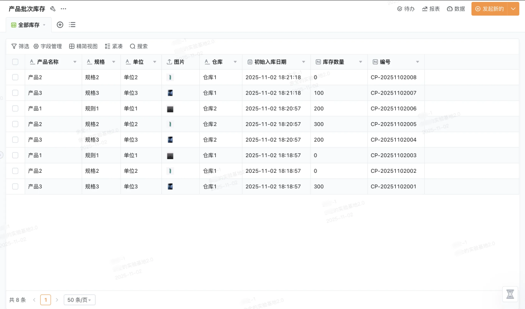 入库信息自动同步:采购的「产品名称」、「规格」、「数量」、仓库等信息自动同步至批次库存表