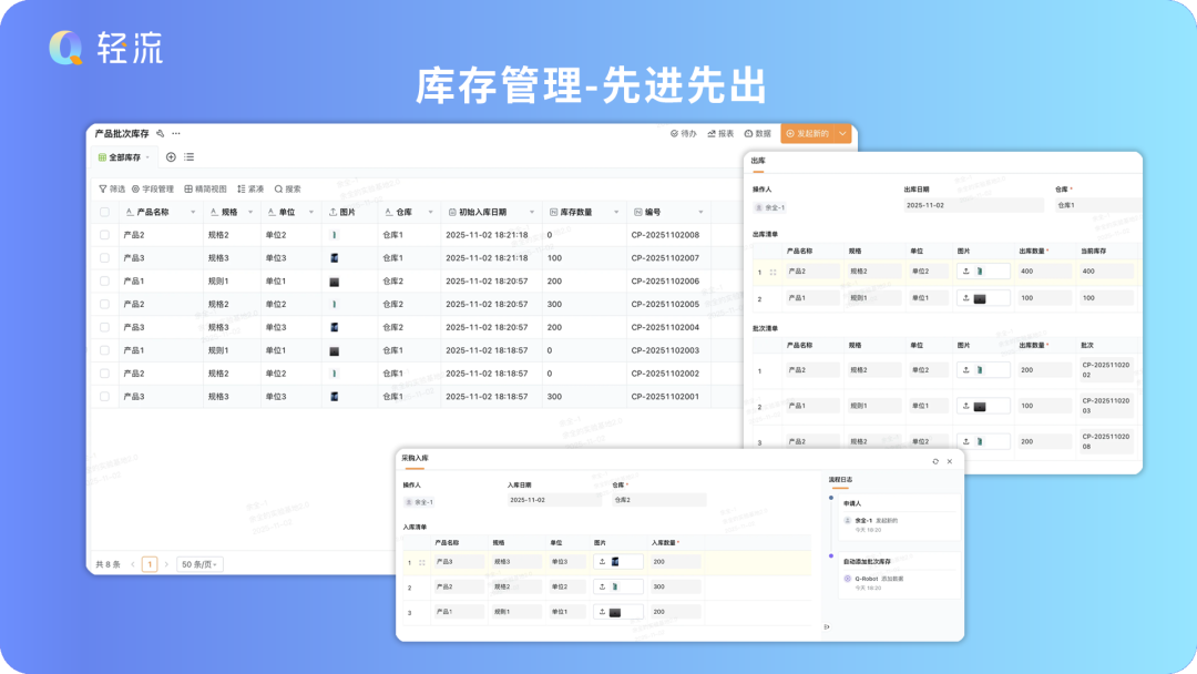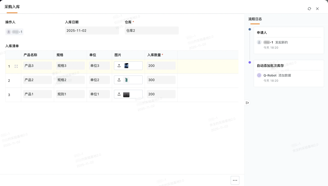 入库流程全程可追溯:流程日志自动记录「申请人」、「操作时间」,实现入库全流程可追溯
