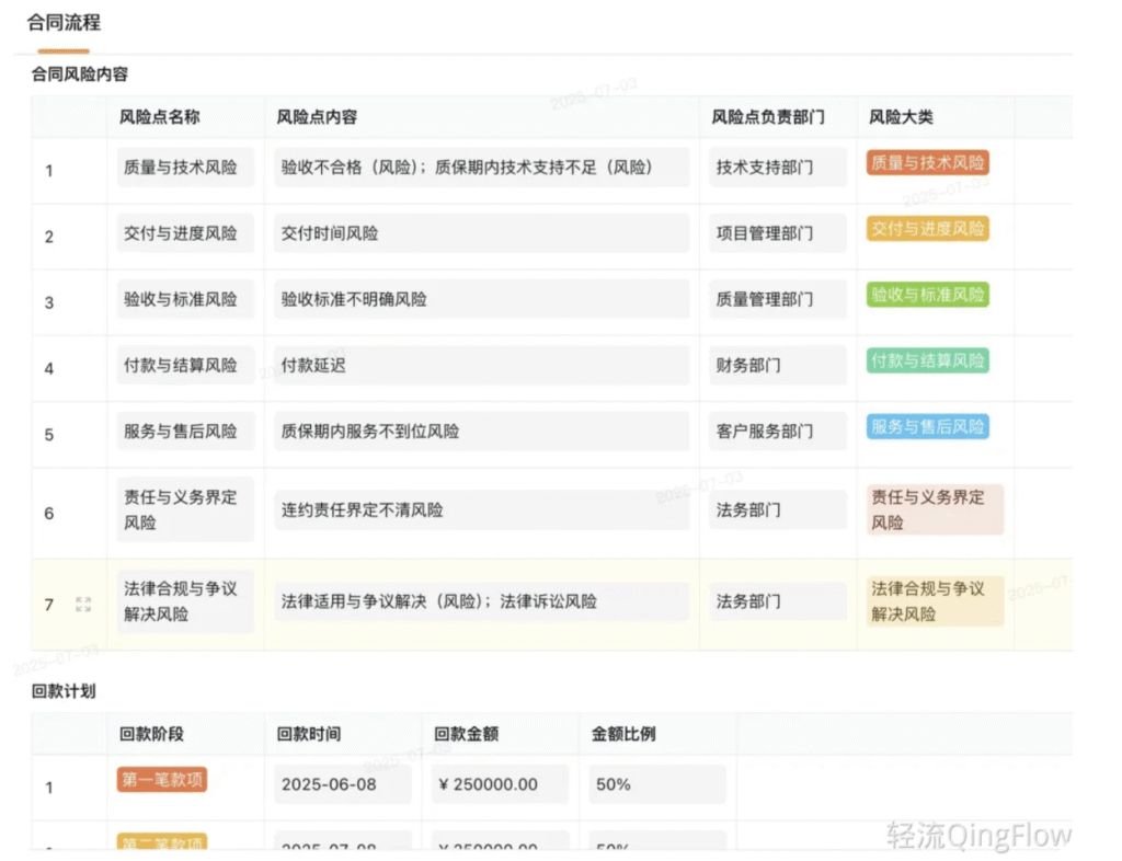 - 提质提效,解放人力:AI自动完成合同解析、关键信息提取、风险识别,替代大量重复性人工工作,大幅缩短合同建档、审核周期,减轻法务、业务、财务团队的工作负担,让员工聚焦核心业务,提升全团队工作效能。